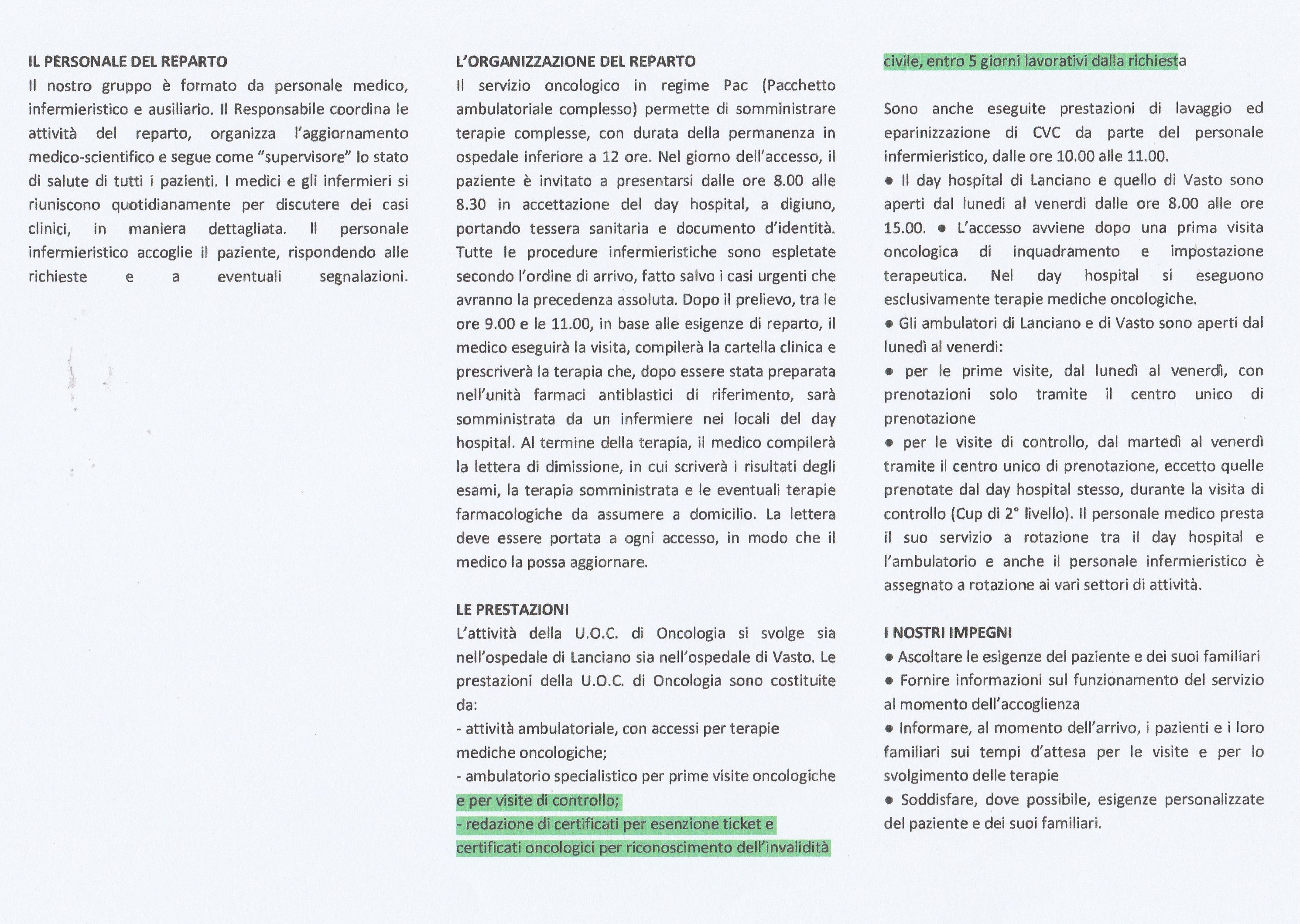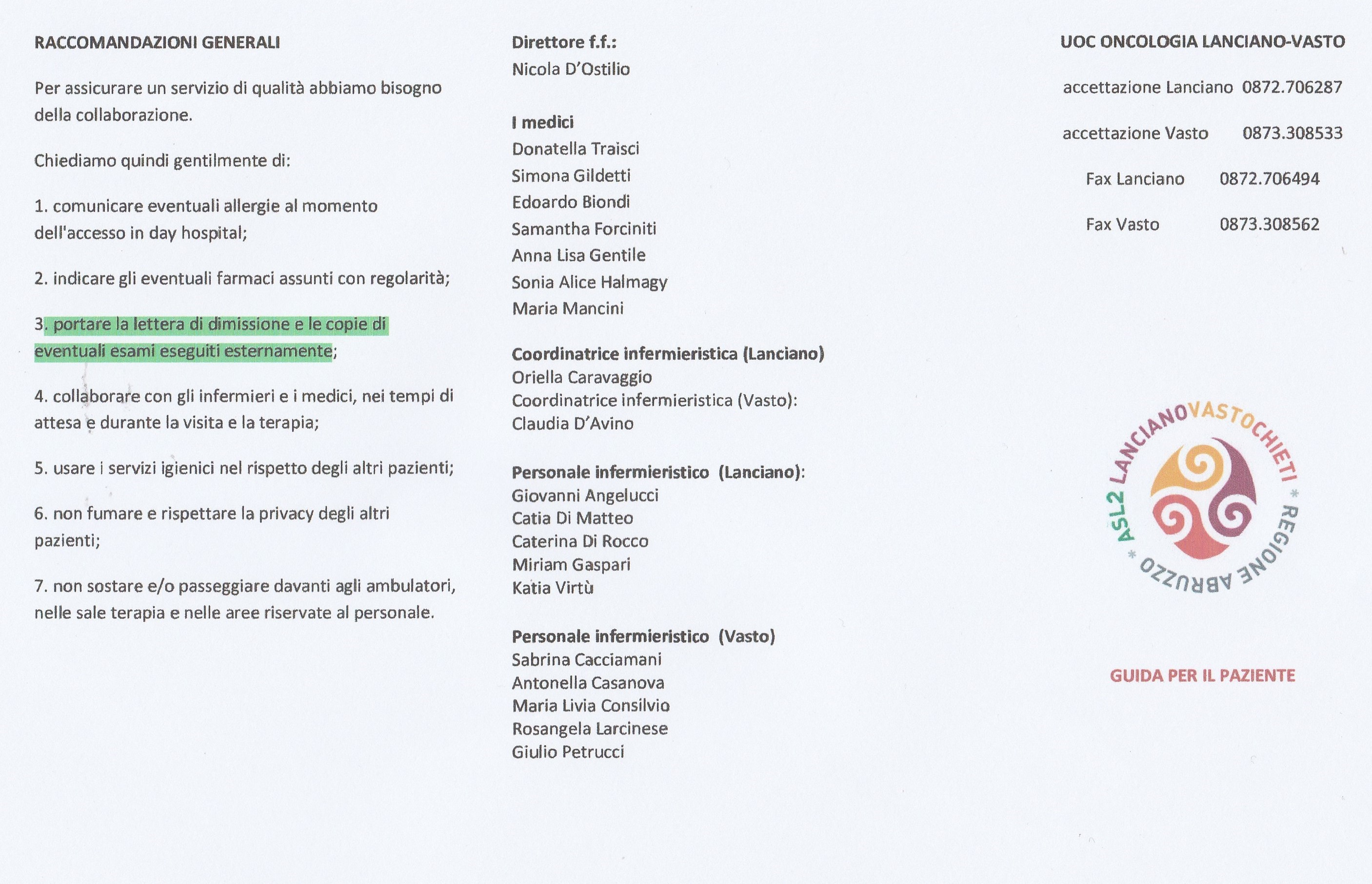 Al punto 3) delle RACCOMANDAZIONI GENERALI nella Guida per il Paziente della UOC Oncologia Lanciano-Vasto si legge: portare la lettera di dimissione e le copie di eventulali esami eseguiti esternamente, si può interpretare anche per la presentazione di reperti diagnostici e consulenze espresse anche da altri specialisti o primari esercitanti altrove, consultati per un parere che può o non concordare con la dirigenza di oncologia del "San Pio" di Vasto. Sempre nell'opuscolo, nella voce "LE PRESTAZIONI" tra le varie attività elencate leggiamo: -redazione di certificati per esenzione tiket e certificati oncologici per il riconoscimento dell'invalidità civile, entro 5 giorni lavorativi dalla richiesta. Ebbene, premesso quanto precede, è possibile che dopo tali affermazioni scritte, che possono leggere qui sotto in quando allegate, si possa essere così permalosi, suscettibili, ombrosi, facili a risentirsi di negare la possibilità di avere le impegnative di richiesta per accertamenti circa il controllo della attività oncologica, il rilascio dei certificati per il riconoscimento dell'invalidità civile. Per tutta risposta "Sei andato all'Istituto Europeo di Oncologia IEO di Milano? Ora fatti erogare da loro questi servizi" pur essendo in carico, seguito dall'UOC Oncologia Lanciano-Vasto, al "San Pio" di Vasto. Questo è quanto accade riferito per certo da un paziente oncologico. . .